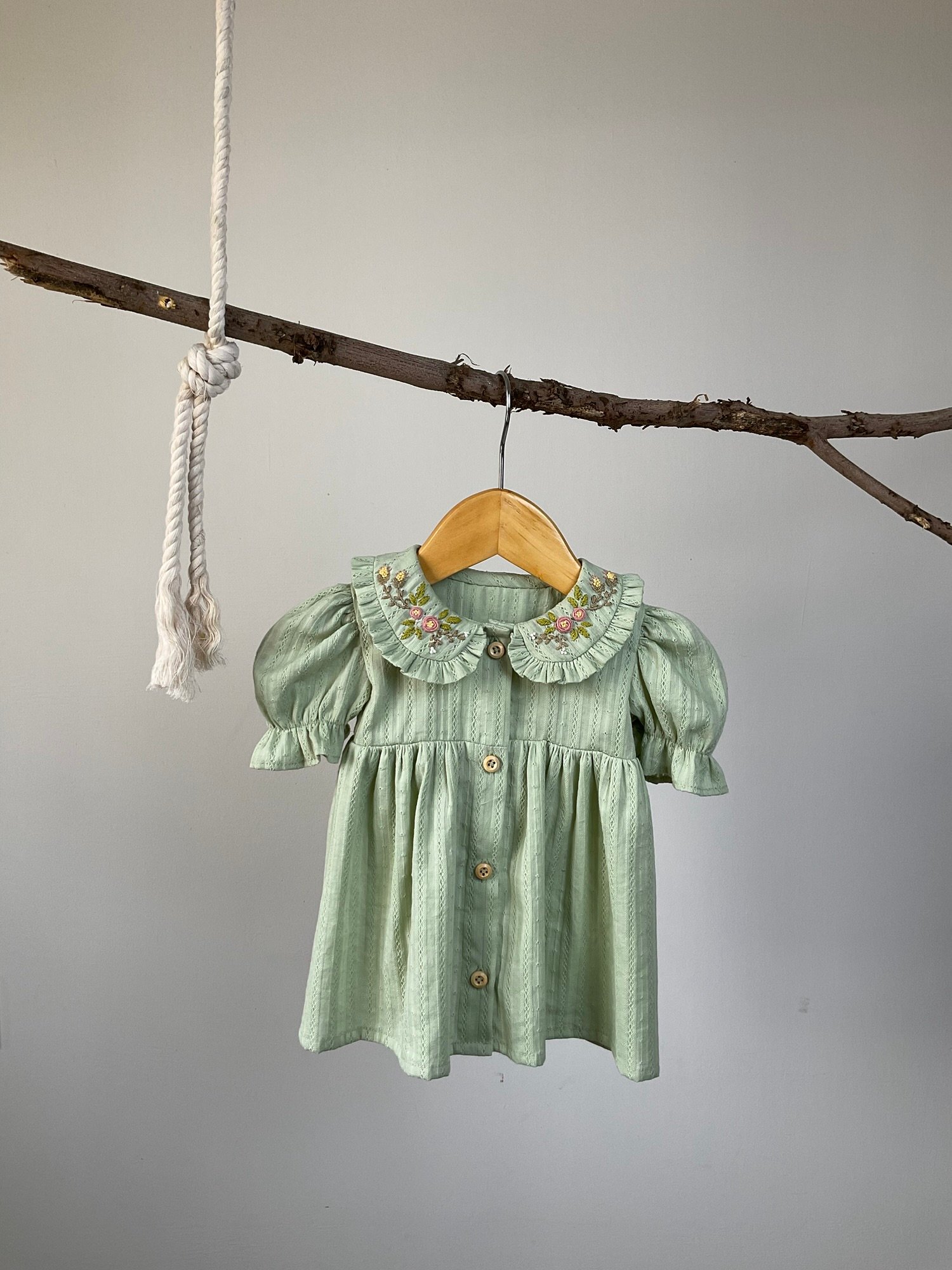 Introducing Mint Mallow – a handcrafted baby frock in a calming mint green, made with breathable cotton and finished with a delicately hand-embroidered ruffle collar. Designed for everyday ease, yet special enough for first birthdays, photoshoots, or gifting moments.